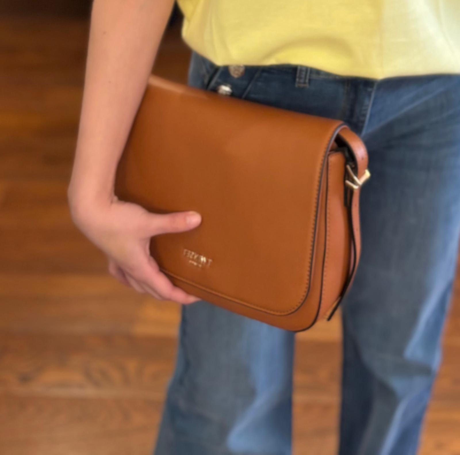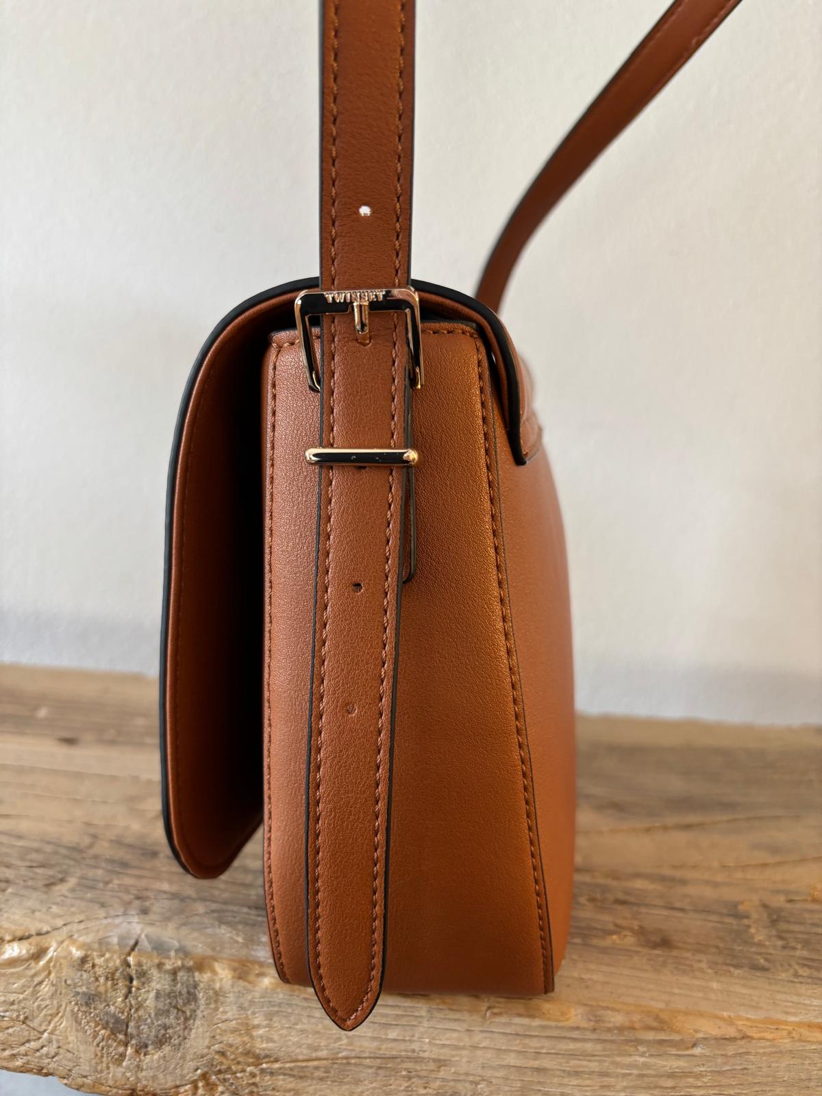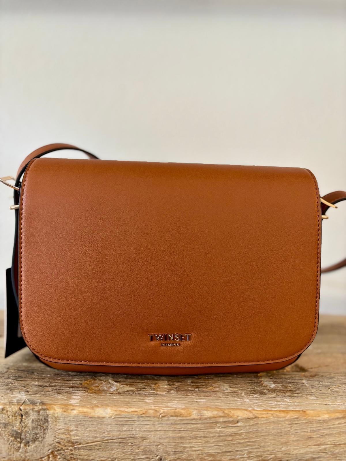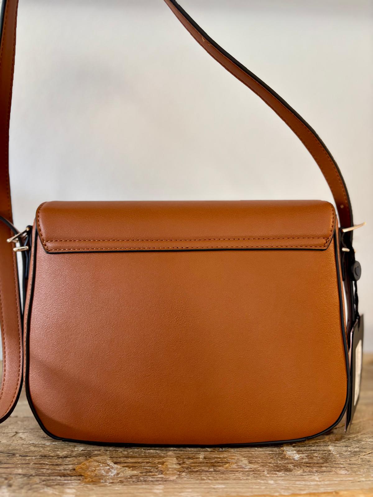 Borsa a tracolla dalla forma arrotondata effetto pelle di vitello morbida con leggera grana naturale, coste rifinite a contrasto. Chiusura con patta e magnete, tracolla regolabile , foderata.