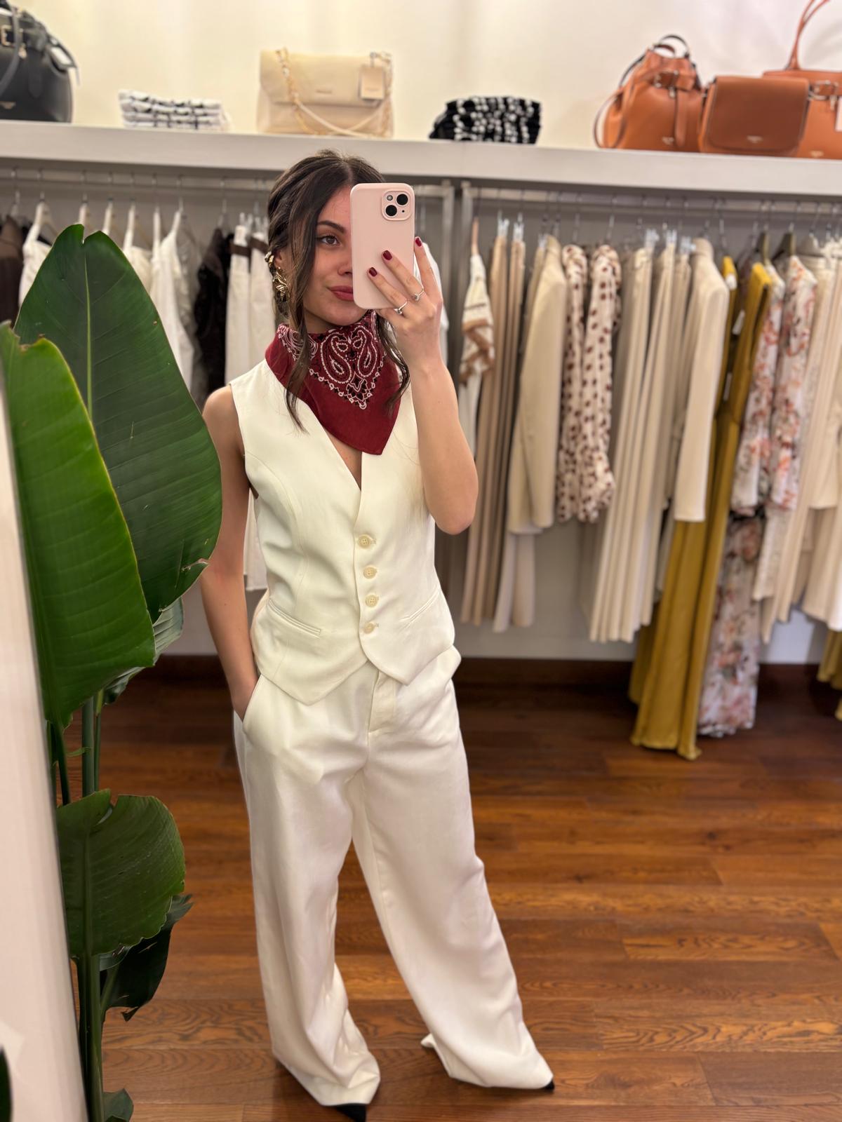 Completo Tailleur formato da gilet e Pantalone fluido color latte e foulard bandana.