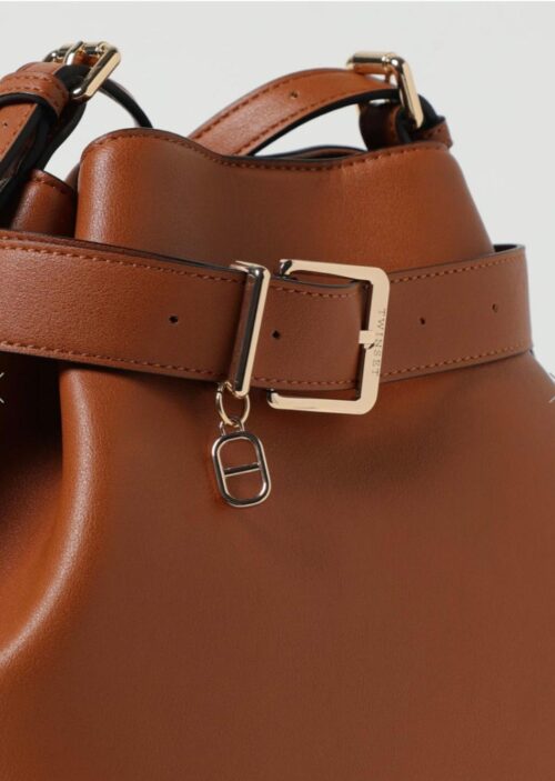 Borsa a secchiello con fibbia e passante logati con charm Oval T e lettering in metallo. Chiusura con magnete, la tracolla regolabile da indossare cross-body, metallo finitura oro lucido, un comparto principale, tasca con zip e tasca interna.