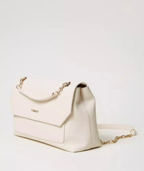 Borsa a tracolla effetto pelle di vitello liscio personalizzata con logo Oval T in metallo. Chiusura compatta sagomata e magnete, tasca piatta davanti, tracolla in catena scorrevole per una doppia portata, a spalla e cross-body, spallacci effetto pelle per un maggiore comfort, galvaniche color oro satinato. Costruzione interna con tramezzo centrale e fodera.